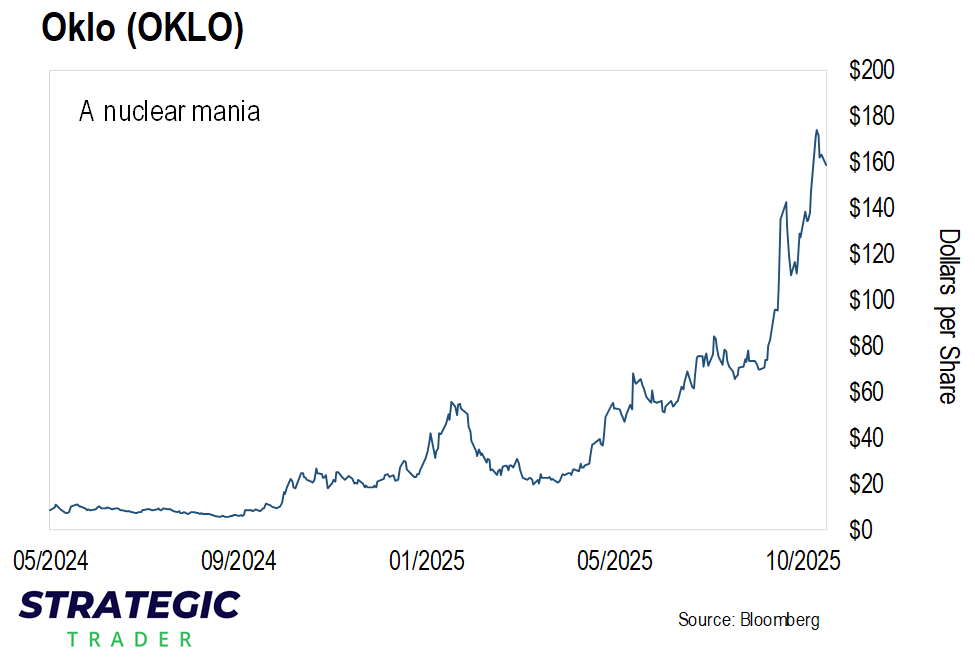 Yes, we’re seeing some manias in certain corners of the market today. Like in the nuclear sector. Just take a look at this chart of small modular reactor (SMR) company Oklo (OKLO) which still doesn’t have approval for its SMR design.