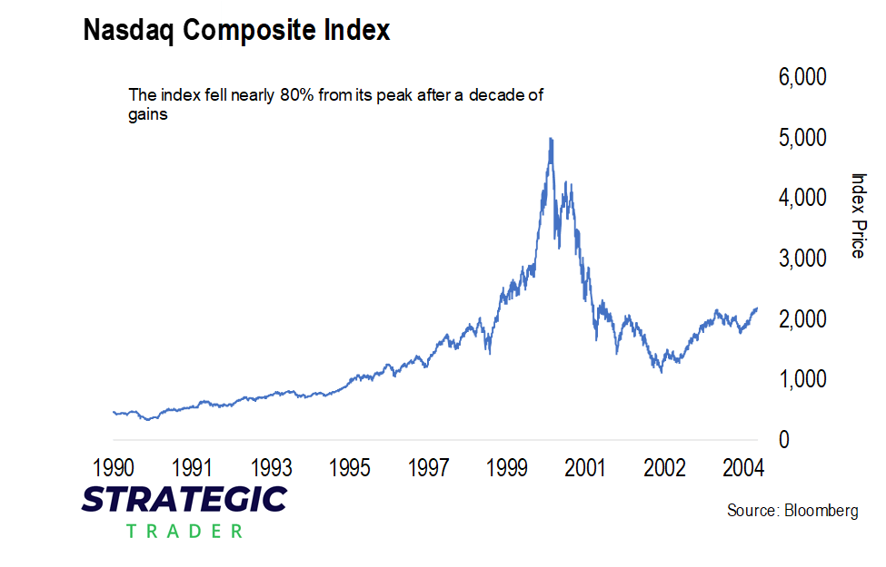 Overall, the tech-heavy Nasdaq Index surged more than 900% between 1990 and the dotcom bubble top in March of 2000. When it ended, the Nasdaq fell 78% from its high. It took just about everything with it.